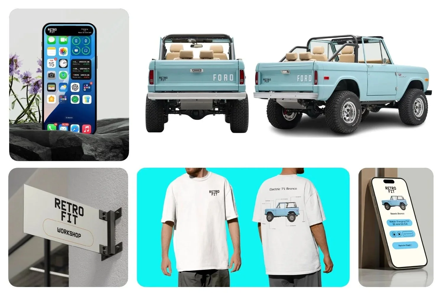 I developed a brand system that positions Retro Fit as a lifestyle brand, not just a car conversion service. Informed by research into Palm Springs car culture, the strategy focused on shaping the ownership experience and how the Bronco fits into everyday life. Merchandise, retail touch points, and the customer experience work together to support an identity rooted in craftsmanship, nostalgia, and modern practicality.